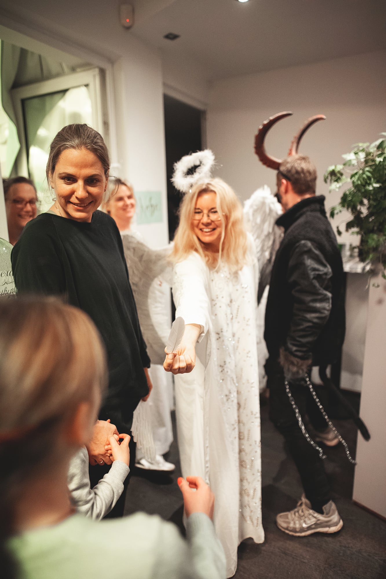 Doporučujeme dětem dorazit v duchu večera – malý čertík nebo andílek 🖤🤍 Oblečení podle tématu pomůže vytvořit tu pravou vánoční atmosféru!